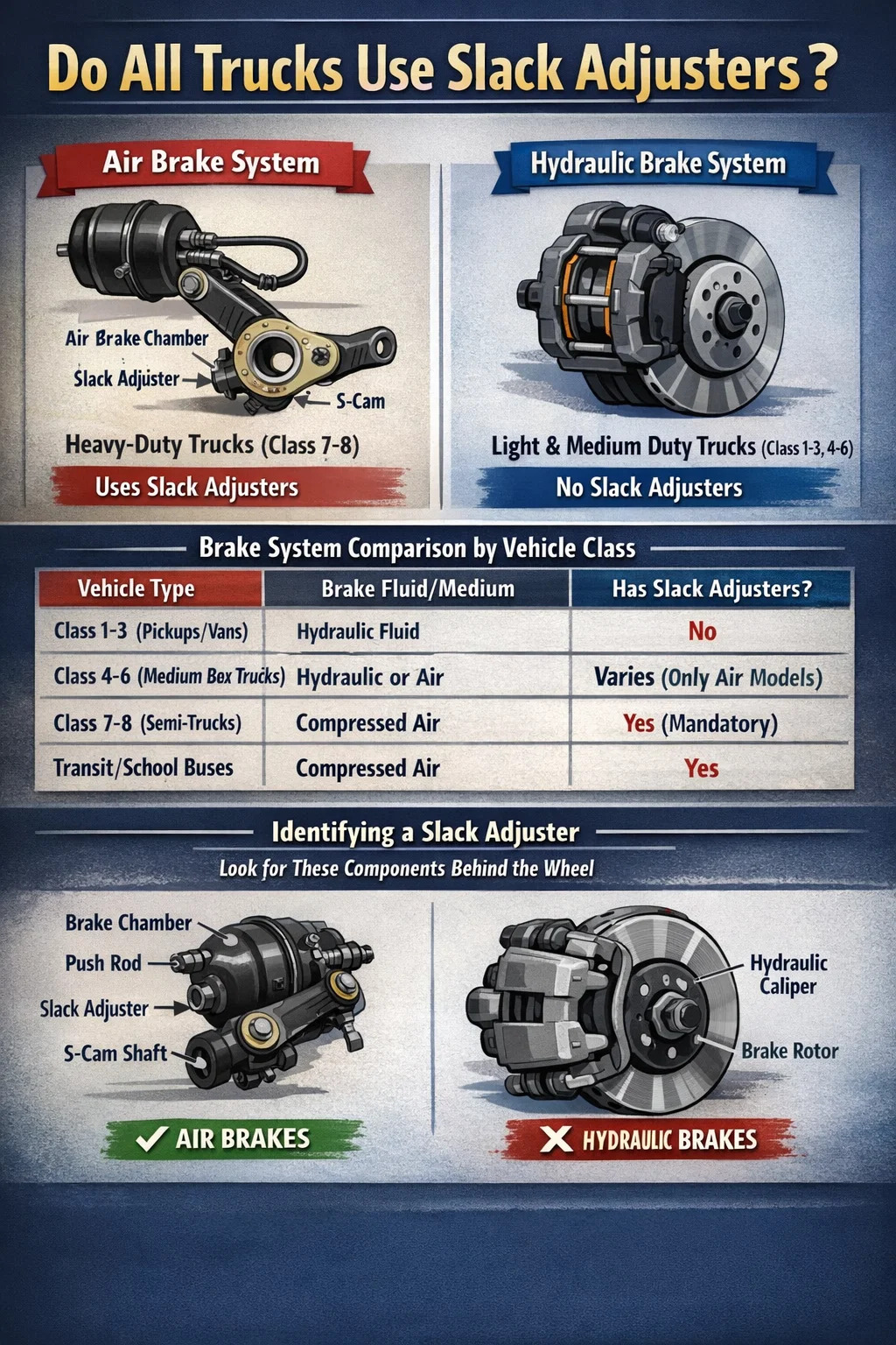 ไม่ รถบรรทุกบางคันไม่มีตัวปรับระยะหย่อน รถบรรทุกจะติดตั้งส่วนประกอบเหล่านี้หรือไม่นั้นขึ้นอยู่กับระบบเบรกของรถบรรทุก โดยเฉพาะ ตัวปรับความหย่อน เป็นส่วนพื้นฐานของระบบเบรกลมที่พบในรถยนต์เพื่อการพาณิชย์ที่ใช้งานหนัก (รถบรรทุกประเภท 7 และประเภท 8) รถบรรทุกขนาดเล็ก เช่น รถกระบะมาตรฐาน (คลาส 1-3) และรถบรรทุกขนาดกลางจำนวนมากใช้ระบบเบรกไฮดรอลิก ซึ่งไม่ใช้กลไกตัวปรับระยะหย่อนเพื่อรักษาผ้าเบรกหรือระยะห่างจากผ้าเบรก