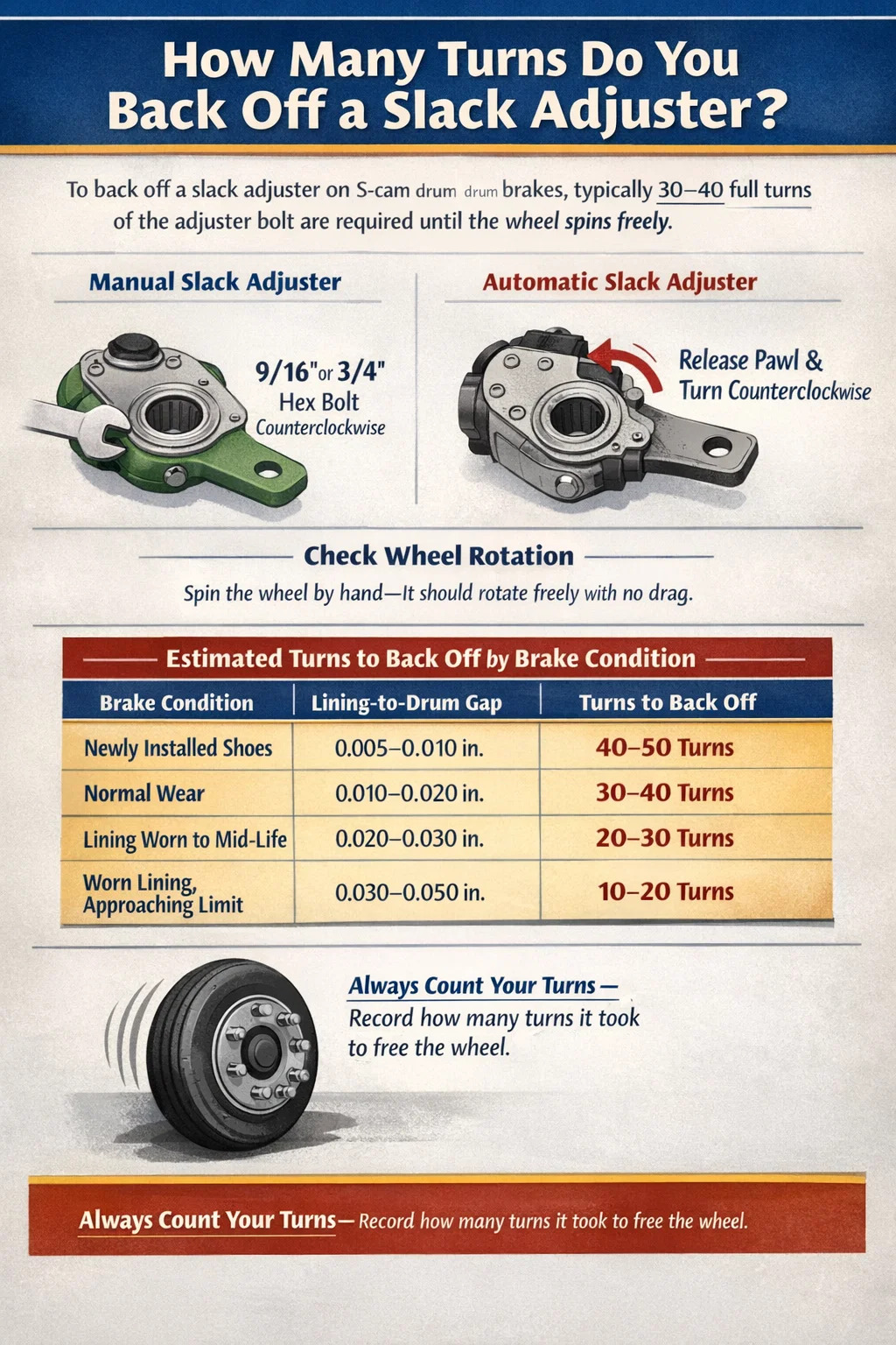 ได้ หากดรัมใหม่มีเส้นผ่านศูนย์กลางภายในแตกต่างจากของเดิม ดรัมที่กลึงหรือเปลี่ยนด้วยอันใหม่ที่มีเส้นผ่านศูนย์กลางมาตรฐานมีแนวโน้มว่าจะต้องใช้การหมุนกลับน้อยลงเพื่อดึงฐานรองที่มีอยู่ แต่เป้าหมายการปรับขั้นสุดท้ายยังคงเหมือนเดิม: ระยะชักภายใน 1.25–1.75 นิ้ว ที่การใช้งาน 90 psi ตรวจสอบระยะชักทุกครั้งหลังจากเปลี่ยนดรัม แม้ว่าจะไม่ได้สัมผัสรองเท้าก็ตาม
