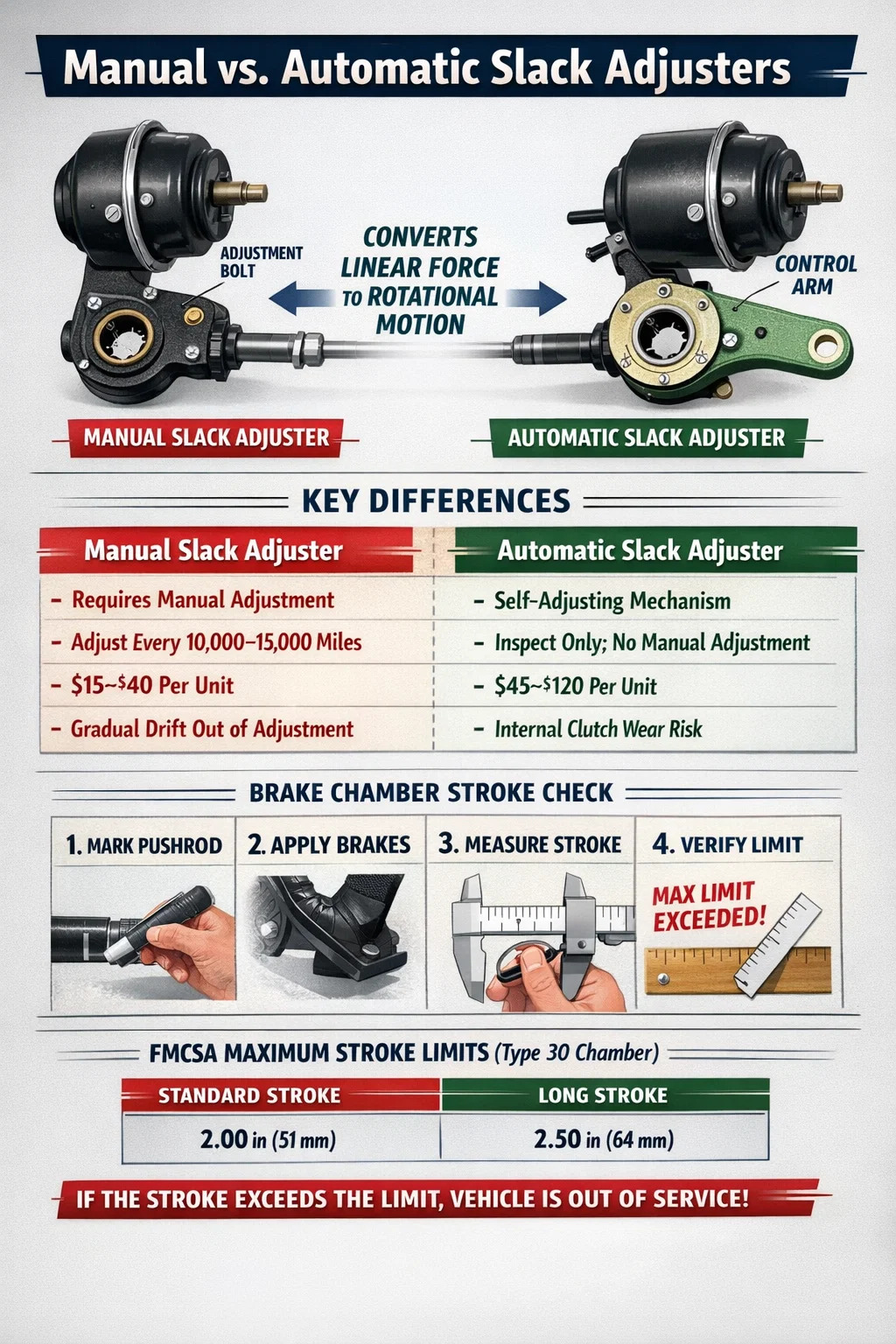 Commercial Vehicle Safety Alliance (CVSA) เผยแพร่เกณฑ์การไม่ให้บริการประจำปีที่ผู้ตรวจสอบใช้ในระหว่างการตรวจสอบริมถนนระดับ I, II และ III การปรับเบรก — โดยเฉพาะระยะก้านกระทุ้ง — เป็นหนึ่งในเงื่อนไขการไม่ใช้งานที่ถูกอ้างถึงบ่อยที่สุดสำหรับรถยนต์เพื่อการพาณิชย์ในอเมริกาเหนือ