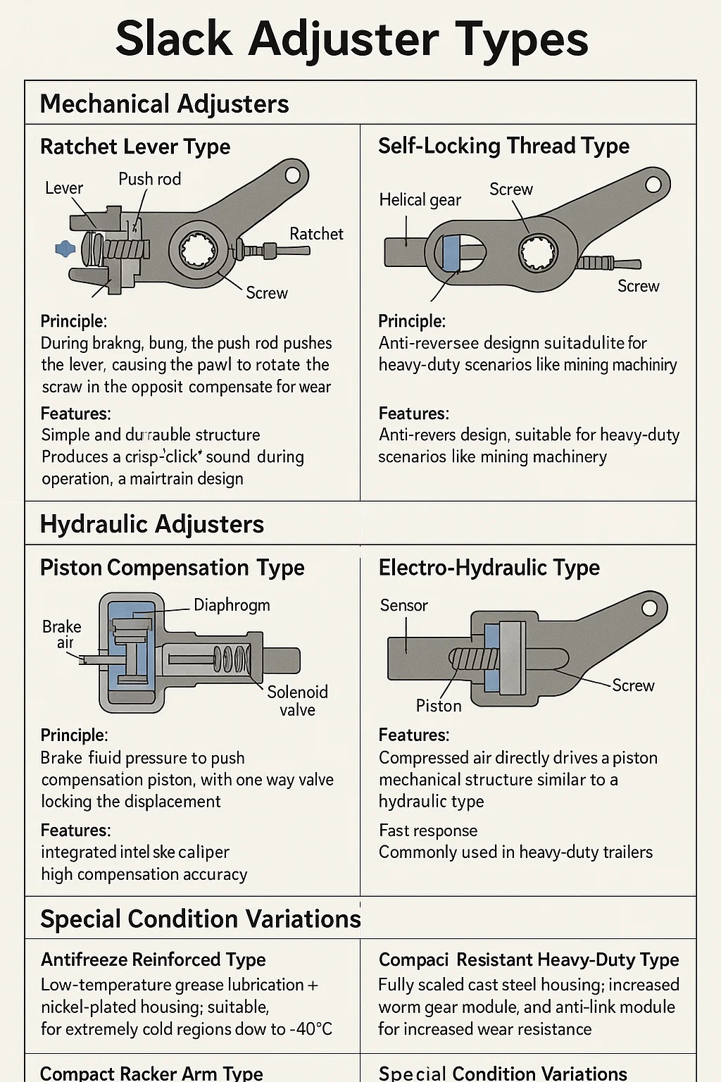 หลักการ: คลัตช์เกียร์แบบเกลียวที่ปลายก้านกระทุ้งจะประกอบทันทีที่ปล่อยเบรก โดยหมุนสกรูไปในทิศทางตรงกันข้ามเพื่อให้ได้ค่าชดเชย