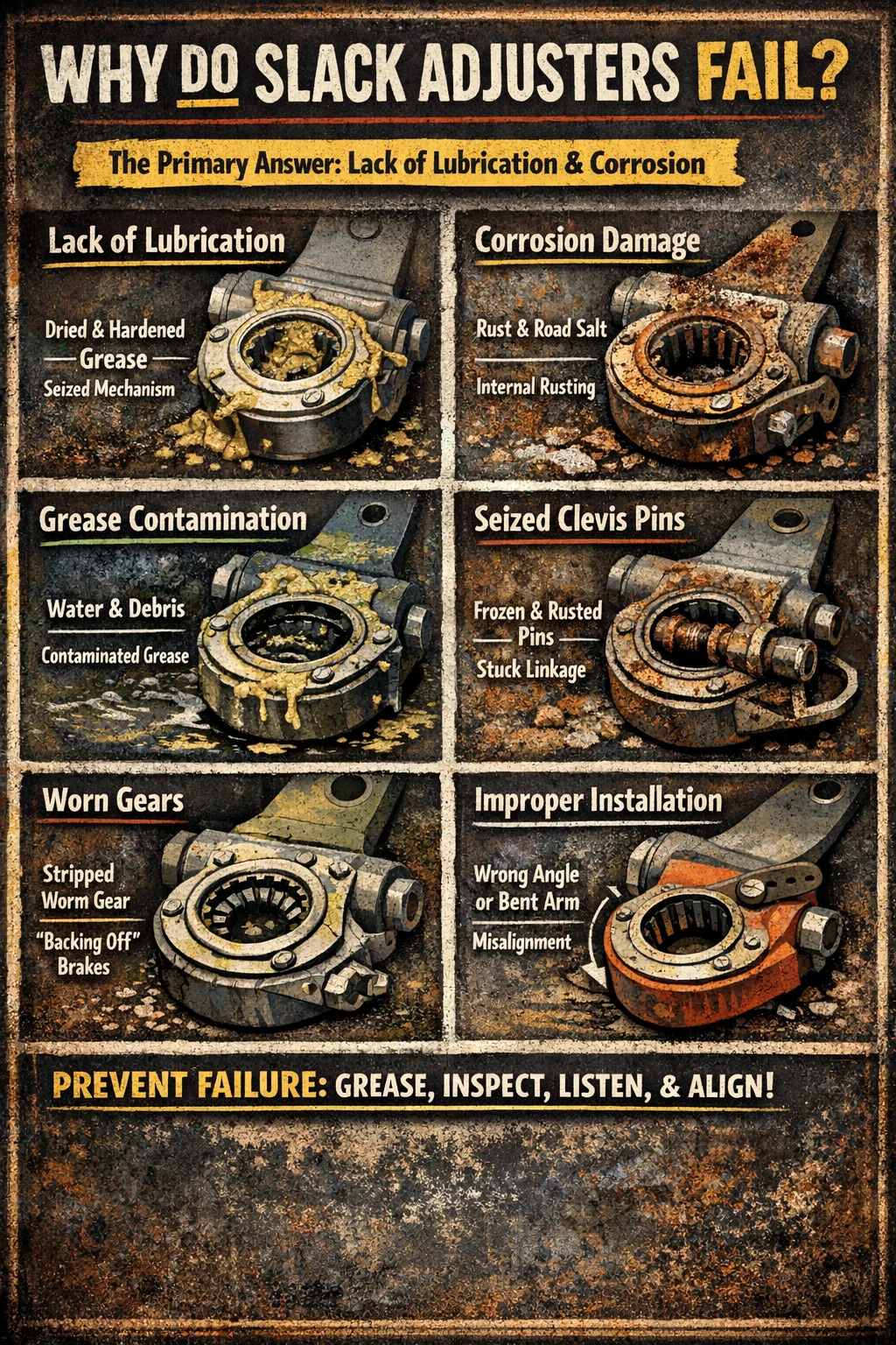 ในกรณีส่วนใหญ่นั้น ตัวปรับระยะหย่อนล้มเหลวเนื่องจากขาดการหล่อลื่นตามปกติและการกัดกร่อนจากสิ่งแวดล้อม เนื่องจากส่วนประกอบเหล่านี้ตั้งอยู่ที่ด้านล่างของแชสซี จึงถูกทิ้งระเบิดด้วยเศษถนน น้ำ และสารเคมีกำจัดน้ำแข็งที่มีฤทธิ์กัดกร่อนอย่างต่อเนื่อง เมื่อจาระบีภายในแห้งหรือปนเปื้อน กลไกเฟืองล้อภายในที่ละเอียดอ่อนจะยึดหรือสึกหรอ ป้องกันไม่ให้ส่วนประกอบปรับระยะห่างยางเบรกโดยอัตโนมัติ สาเหตุรอง ได้แก่ การสึกหรอทางกลไกภายในของเกียร์และการติดตั้งแขนควบคุมที่ไม่เหมาะสม